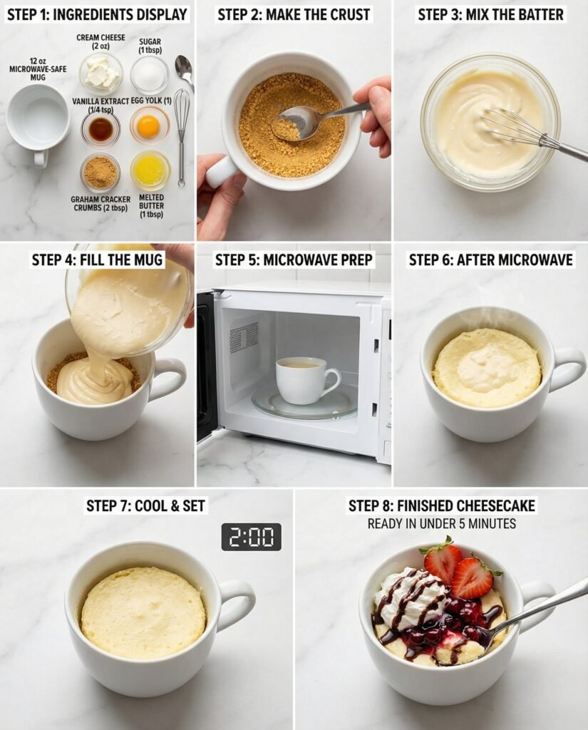 - Prepare the Crust: In a small bowl, mix the crushed graham crackers with melted butter until combined. Press the mixture into the bottom of a microwave-safe mug.