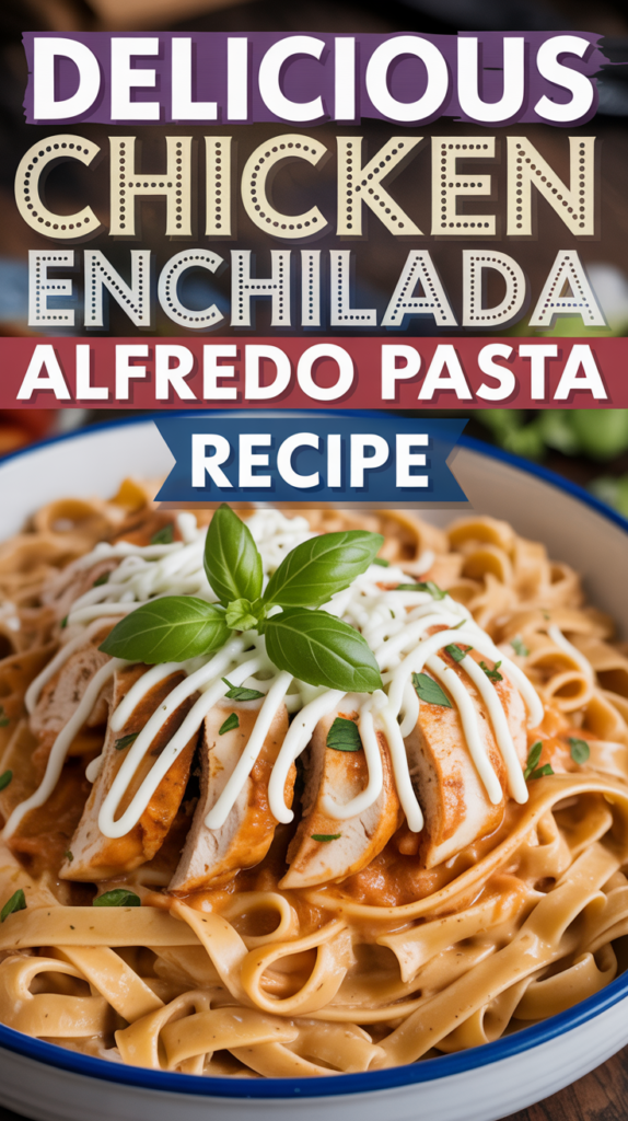 This dish features tender pasta coated in a rich Alfredo sauce, mixed with seasoned chicken, and topped with enchilada flavors. The recipe takes about 30 minutes to prepare and serves 4 people.