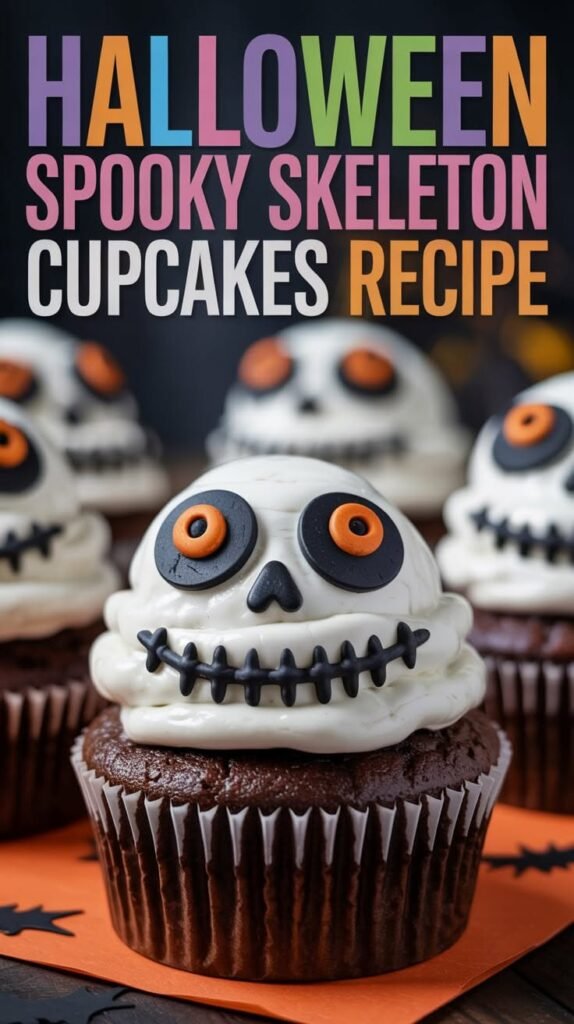 These cupcakes feature a moist chocolate base topped with creamy vanilla frosting, decorated to resemble spooky skeletons. The recipe yields about 12 cupcakes and is perfect for Halloween gatherings.